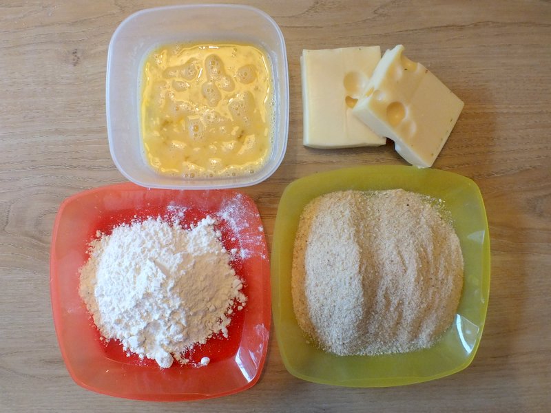 W głębokiej miseczce bełdamy jajka, na płaskich talerzach przygotowujemy bułkę tartą i mąkę. Wyciągamy ser z lodówki. Ważne by był dobrze schłodzony. Panierujemy ser - mąka, jajko, bułka i powtarzamy trzykrotnie. 9 warstw jak na prawdziwy czeski przepis przystało.